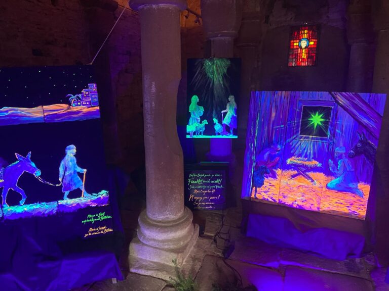 Die Bilder zur Weihnachtsgeschichte wurden mit Schwarzlichtfarben gemalt, die ihre Leuchtkraft erst im Dunkeln und einer speziellen Lampe erhalten.